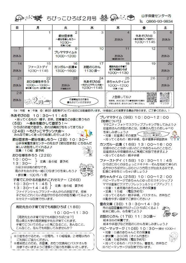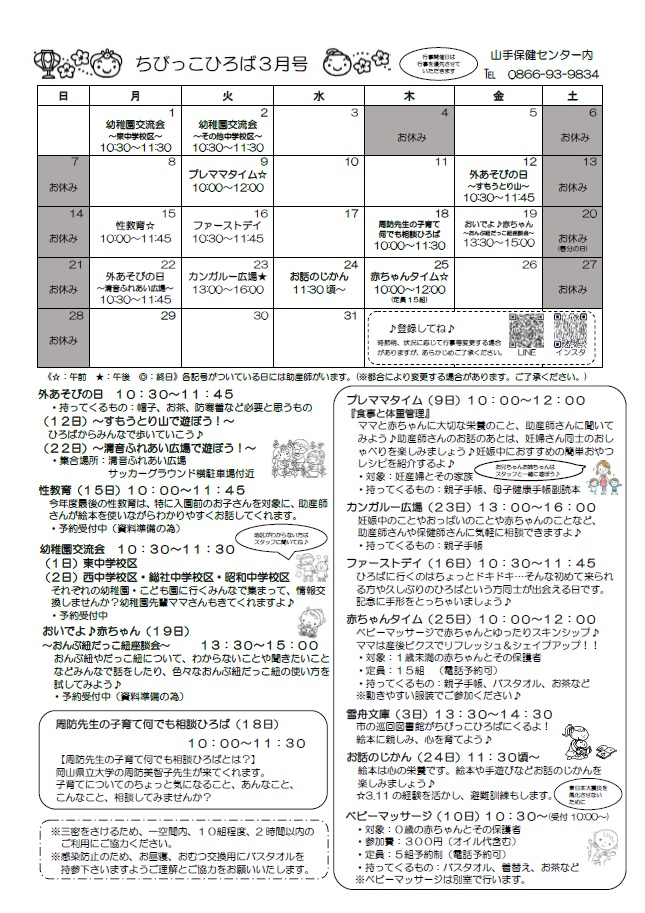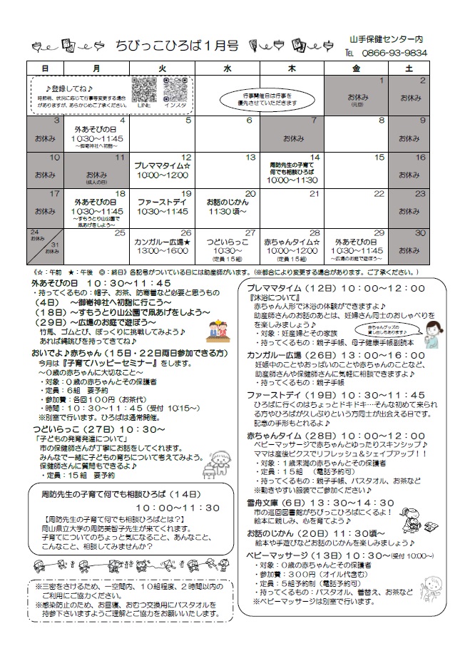 13日、22日は午前、27日は午後、広場に助産師がいて母乳相談などができます。